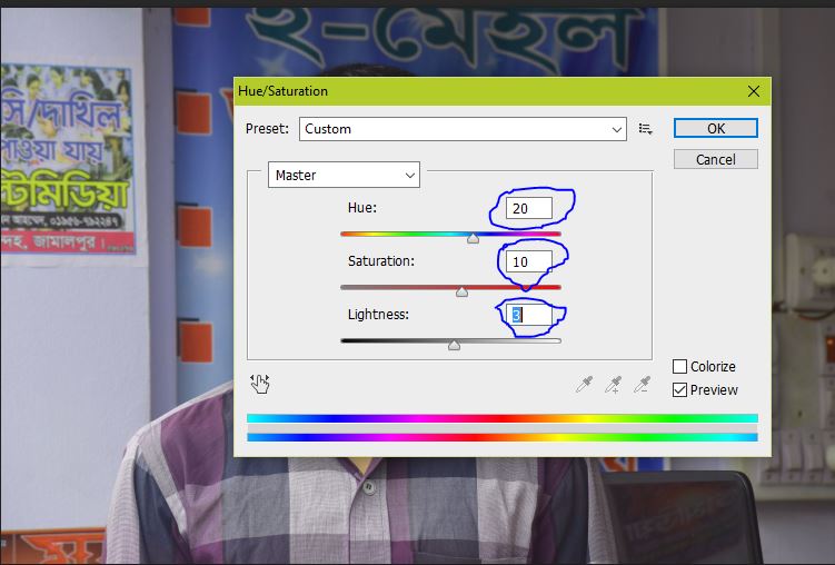 উপরের কাজটি যদি সঠিকভাবে করে থাকেন তাহলে নিচের ছবির মত একটি বক্স আসবে। সেই বক্সে নির্ধারিত মানগুলো দিন। Hue=20, Saturation=10 and Lightness=3 এবার অকে দিন।