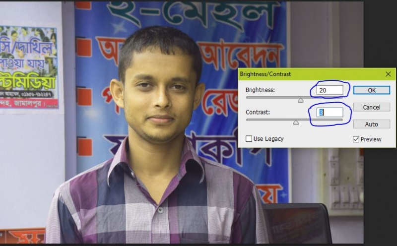 নিচের মত একটি বক্স আসবে। সেখানে মানগুলো দিন Brightness=20 and Contrast=3 তারপর অকে দিন। কাজ শেষ এখন সেভ করুন।