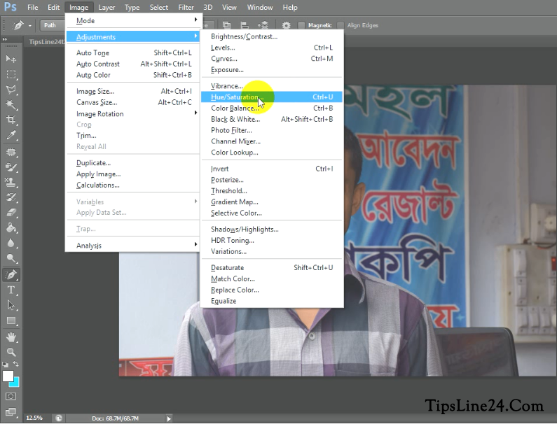 ইমেজটি সঠিকভাবে ওপেন হয়ে গেলে নিচের ছবির কাজ করুন প্রথমে Image এ জান তারপর তারপর Adjustments তারপর Hue/Saturation এ জান। মানে এরকম Image>Adjustments>Hue/Saturation