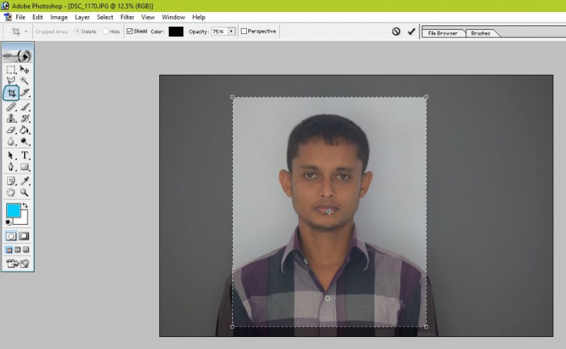 এবার নিচের ছবিটি লক্ষ করুন। ক্রপ টুল সিলেক্ট থাকা অবস্থায় মাউস লেফট ক্লিক করে আপনার যতটুকু রাখতে মন চায় রাখুন। তারপর ইন্টার চাপুন। এবার দেখুন ছবিটি ঠিকঠাক ভাবে কাটা হয়ে গেছে। যে সাইজের ছবি হয়েছে সেটিই পাসপোর্ট সাইজের ছবি। এবার নিচে লক্ষ করুন