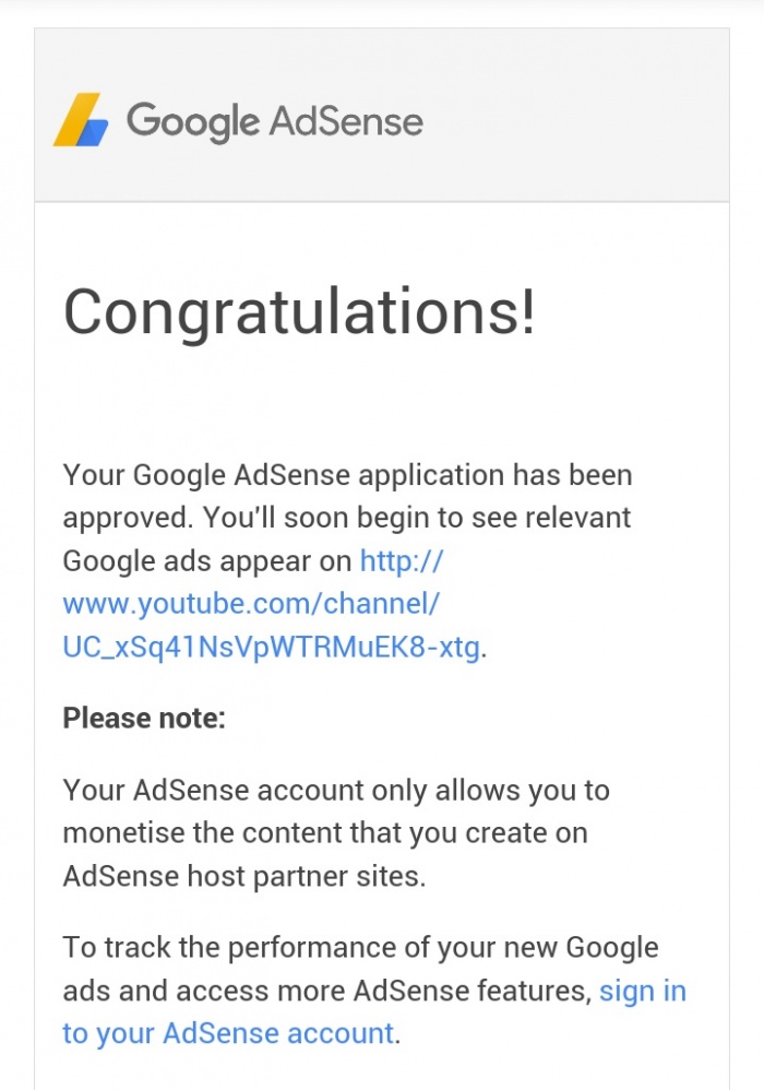 এখানে অামাকে আমার চ্যানেললের লিংক সহ অভিনন্দন জানিয়ে ইউটিউব এডসেন্স সফল ভাবে সম্পন্ন হইছে তার কথা বলা হয়েছে।