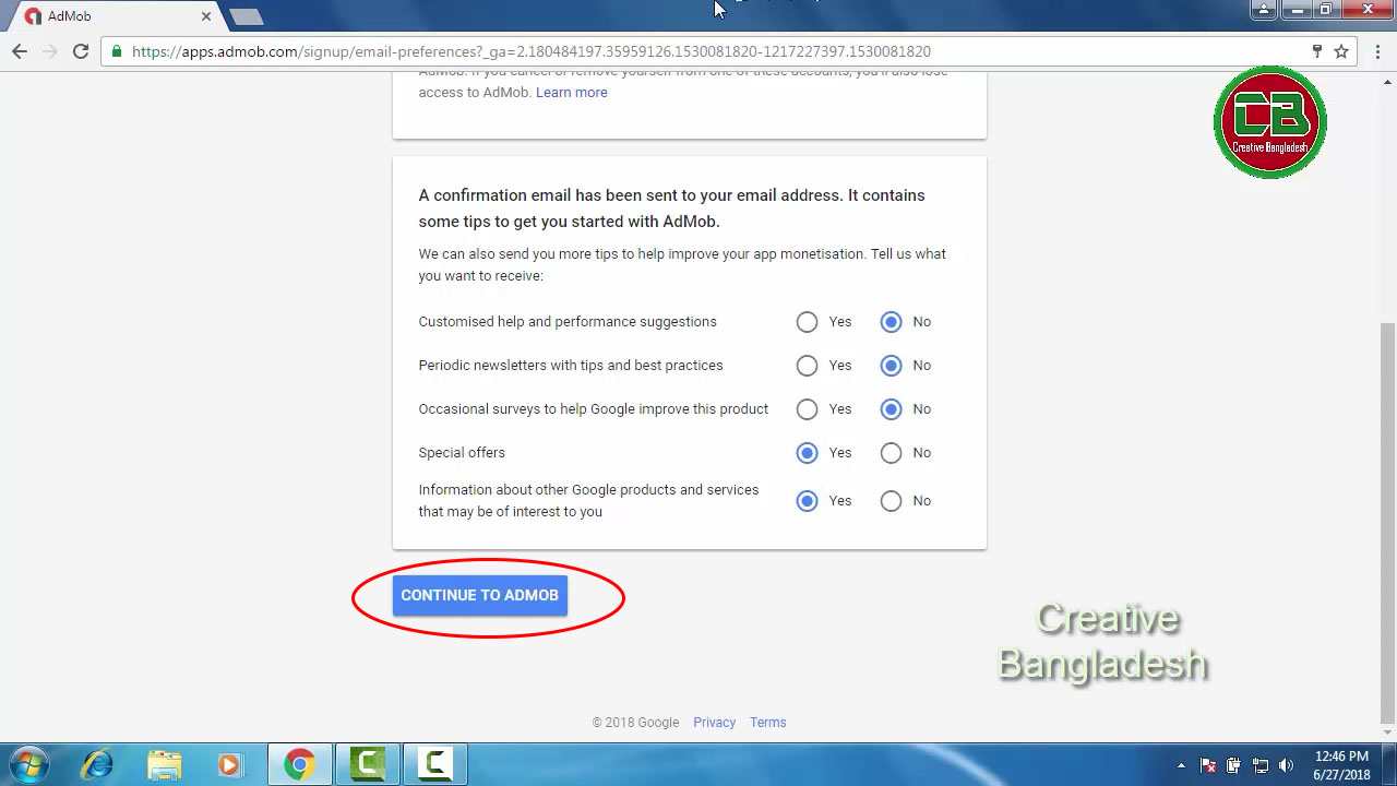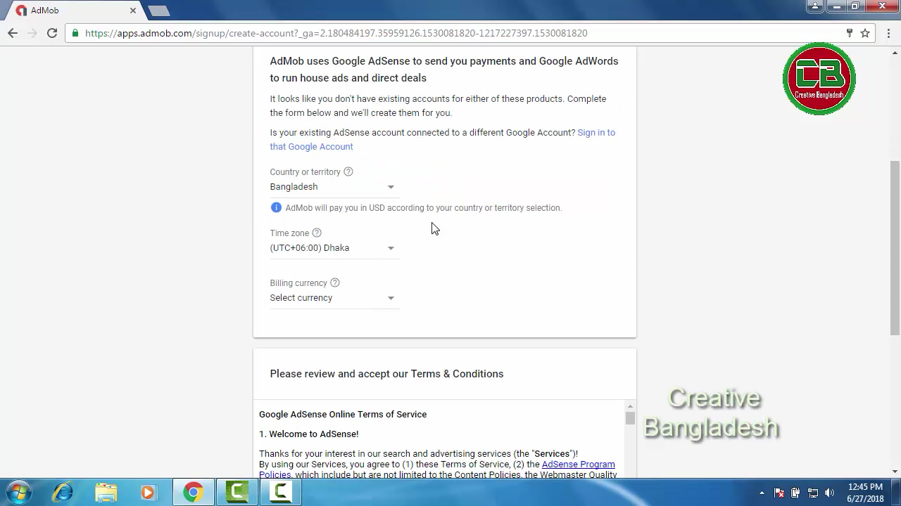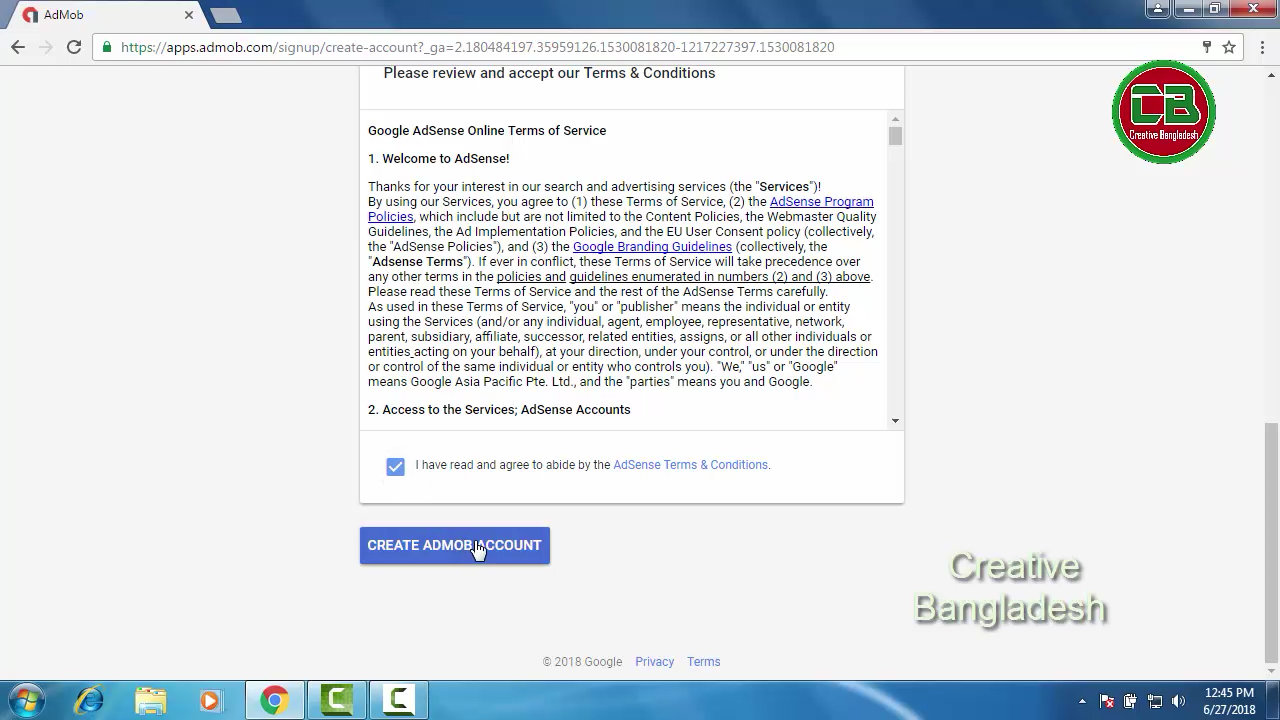 4.এরপর পড়ে চেকবক্স এ টিক দিন এবং create admob account ক্লিক করুন
