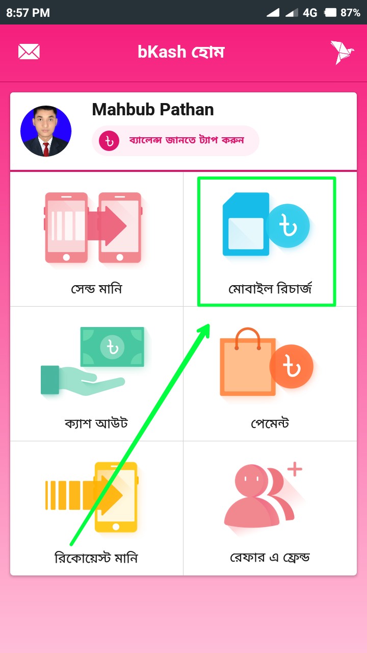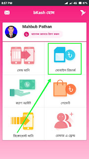 ব্যাস, আপনার বিকাশ অ্যাকাউন্ট বিকাশ অ্যাপে লগইন হয়ে গেছে। এখন আপনাকে অ্যাপে লগইন করার পর থেকে ১৫ (পনেরো) দিনের মধ্যে বিকাশ অ্যাপের মাধ্যমে যেকোনো একটা লেনদেন করতে হবে। যেমন ধরেন ক্যাশআউট, সেন্ড মানি, পেমেন্ট ও মোবাইল রিচার্জ এখান থেকে যেকোনো একটি অল্প অথবা বেশি টাকা লেনদেন করলেই হবে। ভালো হয় অ্যাপটিতে লগইন করার পরপরই বা সাথে সাথেই যেকোনো একটা লেনদেন করা। ধরুন আমরা একদম অল্প টাকার একটি লেনদেন করব সেটা হলো মোবাইল রিচার্জ ১০/- টাকা করব। তাই আপনি উপরের স্ক্রিনশটের মত "মোবাইল রিচার্জ" বাটনে ক্লিক করুন।