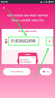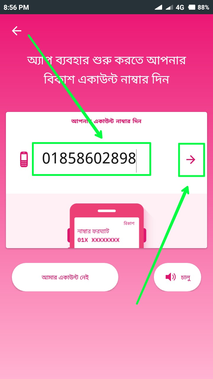 তারপর উপরের স্ক্রিনশটের মত আসবে। এখানে আপনার বিকাশ মোবাইল নম্বরটি দিন। নম্বরটি দিয়ে তীর বাটনে ক্লিক করুন। আর হ্যাঁ, মনে রাখবেন আপনার যে সিম দিয়ে বিকাশ অ্যাকাউন্ট খোলা সেই সিমটি যে মোবাইলে এখন বিকাশ অ্যাপে লগইন করতেছেন সেটিতে লাগানো থাকতে হবে। তাহলে বিকাশ থেকে অটো একটি ভেরিফিকেশন কোড আসবে এবং অটো ভেরিফিকেশনও হয়ে যাবে। তানাহলে কিন্তু অ্যাপটিতে লগইন করতে পারবেন না।
