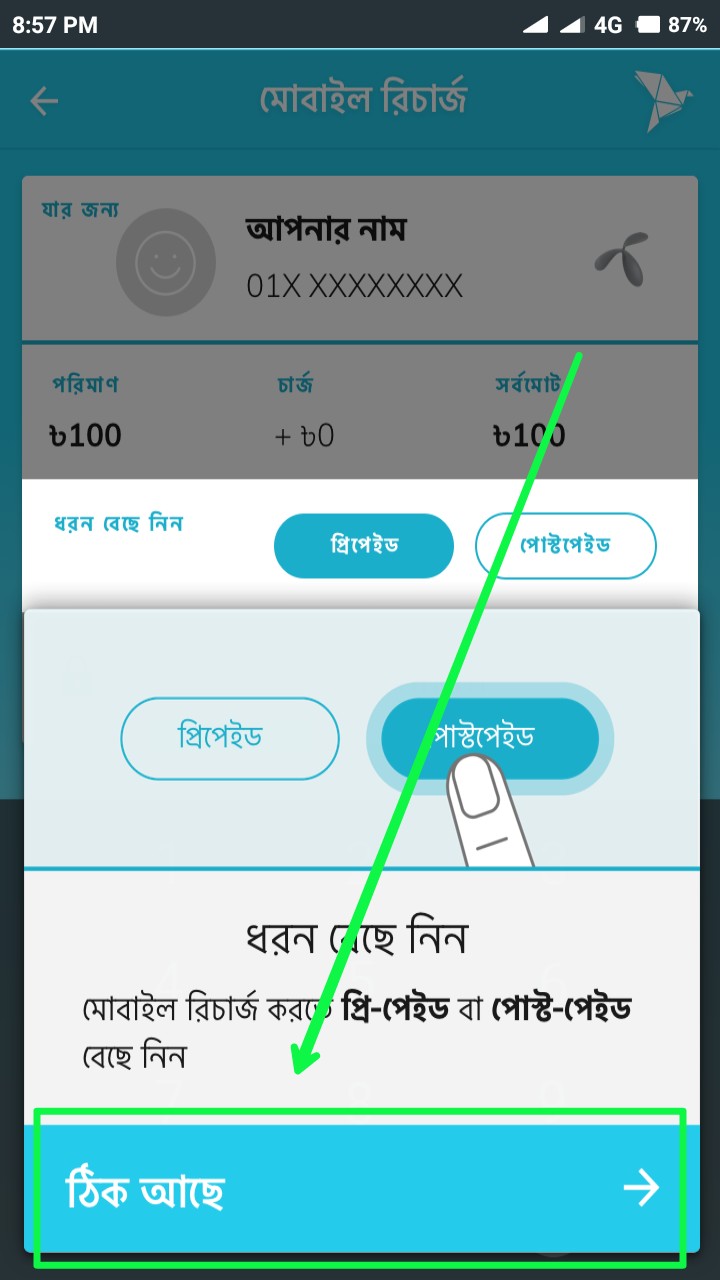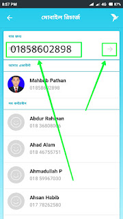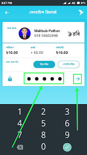 তারপর যে মোবাইল সিম নম্বরে রিচার্জ করতে চান, সেই নম্বরটি উপরের স্ক্রিনশটের সিলেক্টকৃত ঘরে টাইপ করুন বা লিখুন। তারপর তীর বাটনে ক্লিক করুন।