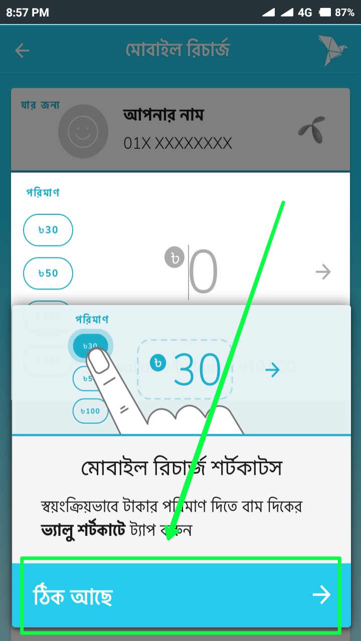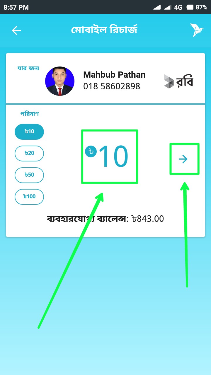 তারপর উপরের স্ক্রিনশটের মত সিলেক্টকৃত স্থানে 10/- টাকা লিখুন বা টাইপ করুন। (বিকাশে ১০/- টাকার নিচে রিচার্জ বা ফ্ল্যাক্সিলোড করা যায় না। ) তারপর তীর বাটনে ক্লিক করুন।