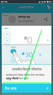তারপর উপরের স্ক্রিনশটের মত আসবে। এখানে স্ক্রিনশটে সিলেক্টকৃত স্থানে কিছুক্ষণ ক্লিক করে ধরে রাখুন, ক্লিক করা ছাড়বেন না। কিছুক্ষণ ক্লিক করে ধরে রাখার পর দেখবেন নতুন একটি পেজ আসবে। যাতে লেখা থাকবে আপনার মোবাইল রিচার্জটি সম্পূর্ণ হয়েছে। (এই ম্যাসেজ না আসা পর্যন্ত ক্লিক করে ধরে রাখতে হবে। ) ব্যাস, হয়ে গেল আপনার মোবাইল রিচার্জ।