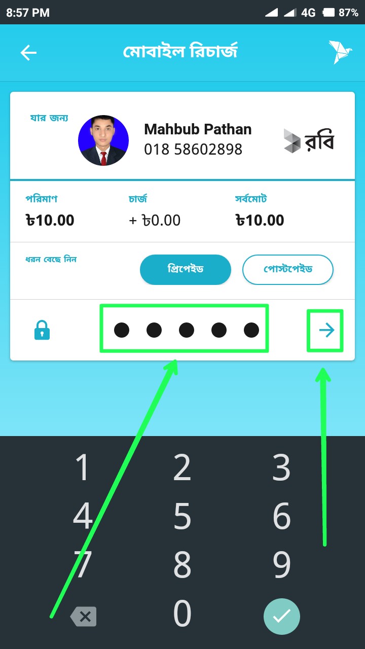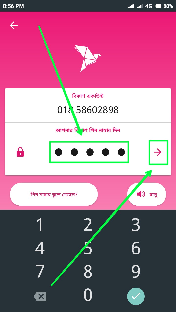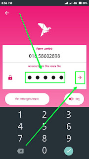 তারপর উপরের স্ক্রিনশটের মত আসবে। এখানে আপনার বিকাশ অ্যাকাউন্টের পিন নম্বরটি দিন। পিন নম্বর লেখার বা টাইপ করার পর তীর বাটনে ক্লিক করুন।