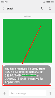 এইবার ১ থেকে ২ দিন অপেক্ষা করুন। এরমধ্যে আপনি একদম ফ্রিতে আপনার বিকাশ অ্যাকাউন্টে ৫০/- টাকা পেয়ে যাবেন। যা ম্যাসেজের মাধ্যমে আপনাকে জানিয়ে দেওয়া হবে ঠিক উপরের স্ক্রিনশটের মত। তারপর আপনার বিকাশ অ্যাকাউন্টের ব্যালেন্স চেক করে দেখুন যে, অ্যাকাউন্টে ফ্রি ৫০/- টাকা যুক্ত হয়েছে কিনা।