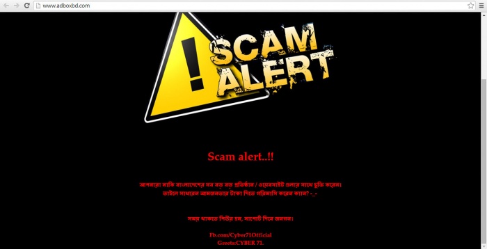 গত কয়েক ঘন্টা আগে adboxbd.com এই সাইটটি হ্যাক করেছে সাইবার ৭১ নামের বাংলাদেশী হ্যাকার গ্রুপ। তারা নাকি এডসেন্স এর এড বড় কোম্পানি বা ওয়েব সাইট ছাড়া, ছোট কোন ওয়েব সাইট বা প্রতিষ্টানে প্রদান করে না। এমন কি তারা সাধারন জনগনের টাকা নিয়ে ঝামেলা করে। এই অভিযোগে সাইবার ৭১ এর এডমিন তানজিম আল ফাহিম adboxbd.com এই সাইটি হ্যাক করে উনার ব্যক্তিগত ফেইসবুক একাউনটে স্ট্যাটাস দেন।