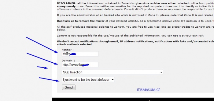 এরপর Domain: এ আপনার ডিফেস পেজের লিংক টি দিন । এরপরের দুটি বক্স হল হ্যাকিং এর মেথড এবং হ্যাকিং এর কারন । এ দুটি আপনার ইচ্ছা মত দিন । এরপর send বাটনে চাপুন । না বুজলে নিচের চিত্র দেখেন