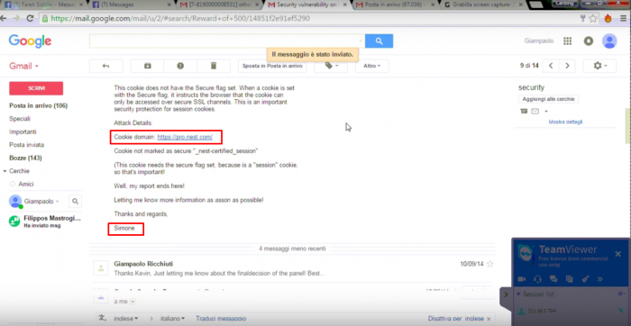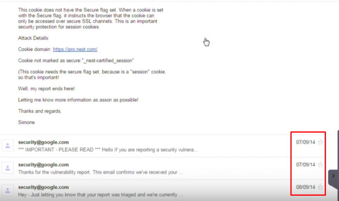 – এটা গুগলের একটা এ্যকুইজিশন সাইট (pro.nest.com), যেখানে তিনারা ইনসিকিউরড কুকিস-এর বাগ রিপোর্ট করেছেন.. বলা বাহুল্য, ইনসিকিউরড কুকিস রিলেটেড ইস্যুগুলি খুবই লো সেভেরিটির বাগ. বেশিরভাগ কোম্পানিই এই ধরণের রিপোর্ট ইগনোর করে.. এজন্য শুধুমাত্র ওয়াmim নুব-রাই এটা বেশিরভাগ সময় রিপোর্ট করে থাকে। কারণ, এর বেশি কিছু করার আওকাদ তাদের নাই।