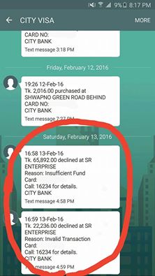 আপনাদের কি মনে হয় এই ঘটনা হ্যাকার রা এক দিনে করেছে ? মনে আছে ২০১৪ সালে সোনালি ব্যাংক থেকে টাকা চুরি হয়েছিল জর্ডান থেকে, কিংবা হালের ব্যাংক এর এ টি এম থেকে টাকা চুরির ঘটনা, এগুলো বিশাল এক চিত্রপটের কিছু ক্ষুদ্র ক্ষুদ্র অংশ মাত্র,সহজে বলা যায় এগুলোই হল সেই ছোত শিকার, আসলে এটি এম এর ঘটনার পরে বেক্তিগত একাউন্ট গুলো হ্যাক করার চেষ্টা করা হয়েছে। নিচের ছবিটি লক্ষ্য করুন এখানে প্রকৃত ব্যবহার কারি জানেনই না যে টাকা ট্রাঞ্জেকশান করার চেস্টা করা হয়েছে, যখন তিনি খেয়াল করলেন সিটি ব্যাংক এর সাথে প্রায় আধা ঘন্টা মুঠফোনে তর্ক করার পরেও তারা এটার সমাধান করতে পারলনা যে এই ঘটনা কিভাবে হয়েছে। যদিও কার্ড টি সাথে সাথেই লক করা হয়েছিল .