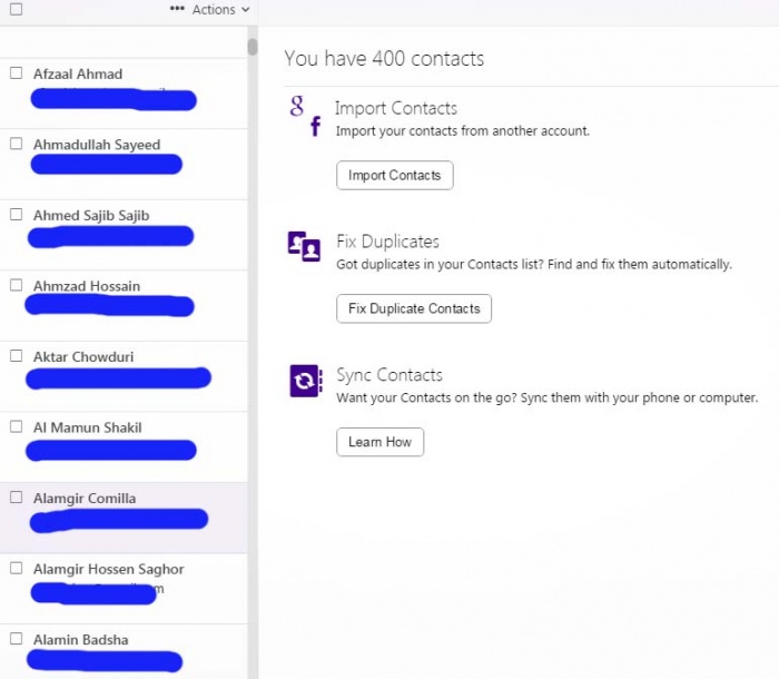 আপনার কাজ শেষ। যে ছবিটি দেখতেছেন তার বাম পাশে তাকিয়ে দেখুন সেগুলোই হলো আপনার ফেজবুক ফ্রেন্ড আর তাদের ই-মেইল এড্রেস। এখানে আমি আমার ফ্রেন্ডদের ই-মেইলগুলো মুছে দিয়েছি ফ্রেন্ডদের একাউন্টের নিরাপত্তার স্বার্থে।