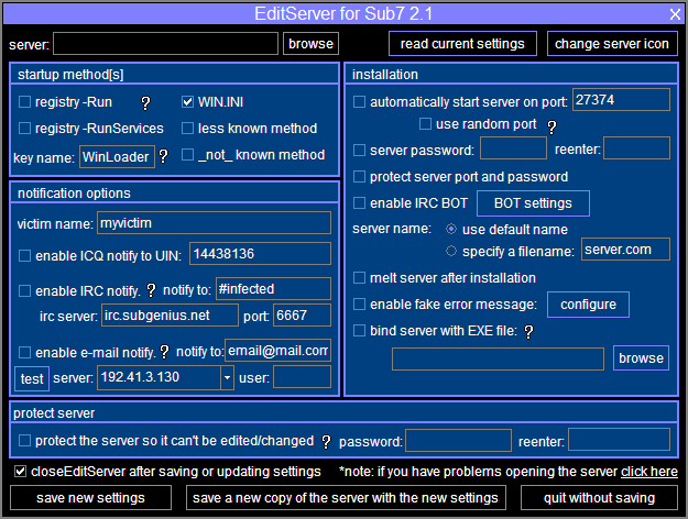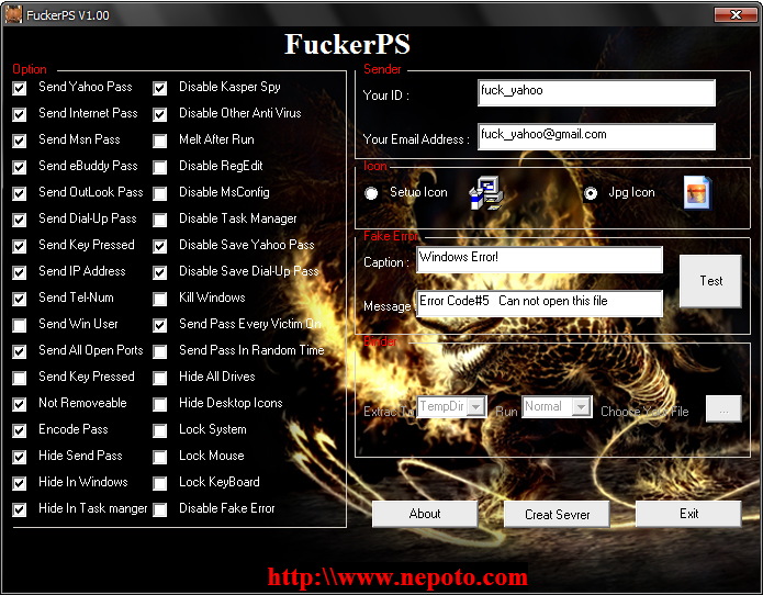 এটা আসলে পাসওয়ার্ড স্টীলার। অনেকটা Lord ps pro এর মত। প্রয়োজনীয় টিক চিহ্নগুলো এবং আপনার মেইল এড্রেসগুলো দিয়ে সার্ভার তৈরী করে কোনো পিসিতে চালু করলে সেই পিসির সকল ইনফরমেশন আপনাকে মেইলের মাধ্যমে জানিয়ে দেওয়া হবে।