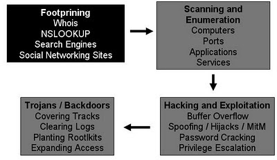 ফুটপ্রিন্টিং – ফুটপ্রিন্টিং হল সবচেয়ে সুবিধাজনক পদক্ষেপ যার মাধ্যমে হ্যাকার কোন কম্পিউটার সিস্টেম বা কোন কোম্পানির গোপন তথ্য সংগ্রহ করার জন্য ব্যবহার করে। এটি অনেকগুলো টেকনিকের সমন্বয়ে করা হয়ে থাকে। ফুটপ্রিন্টিং হল প্রথম পদক্ষেপ যার মাধ্যমে একজন পেনেট্রেশন টেস্টার কোন আইটি অবকাঠামোর নিরাপত্তা মূল্যায়নের জন্য ব্যবহার করে। ফুটপ্রিন্টিং হল প্রথম এবং গুরুত্বপূর্ণ পদক্ষেপ কারণ এর পর পেনেট্রেশন টেস্টার জানতে পারে যে হ্যাকার এই নেটওয়ার্ককে কিভাবে দেখছে। একটি কম্পিউটার সিস্টেমের নিরাপত্তা পরিমাপ করার জন্য ফুটপ্রিন্টিং হল সবচেয়ে গ্রহনযোগ্য পদ্ধতি। কারন একটা সিস্টেম সম্বন্ধে যত জানা যায় ততই সুবিধা কারন এর পর পেনেট্রেশন টেস্টার জানতে পারে যে হ্যাকার কিভাবে নেটওয়ার্কটিকে এক্সপ্লয়েট করতে পারে।