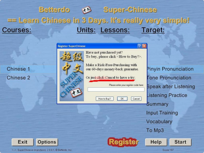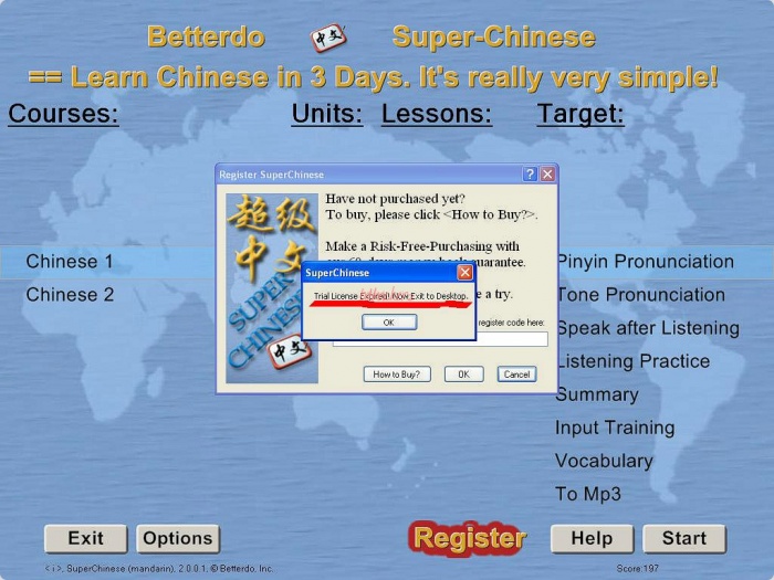 SuperChinese সফটত্তয়্যারটির মেয়াদ ছিল ৬০ দিন। কিন্তু এর ইনস্টল মেয়াদ পার হয়ে যাত্তয়ার কারণে তা বন্ধ হয়ে যাচ্ছে। কিন্তু এই সফটত্তয়্যার দিয়ে আমি পুনরায় ব্যবহার করতে পারছি। এভাবে প্রায় সব ধরণের প্রোগ্রামের সময় বাড়িয়ে নেত্তয়া যেতে পারে।