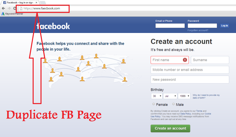 এখন আপনার কাছে সে একটা লোভনীয় ইমেইল/মেসেজ করবে একটি লিংক দিয়ে (যেমনঃ আমি অনলাইনে খুব সহজ উপায়ে টাকা কামানোর একটি সাইট পেয়েছি এবং প্রতিদিন ৫০০$ ইনকাম করছি নিচের সাইটটি হতে – ww.faecbook.com/Easy-Way-to-Earn-Money) এবং আপনাকে সেই লিংকে ক্লিক করার জন্য আমন্ত্রণ করবে। আপনি যদি সেই লিংকএ ক্লিক করেন তাহলে আপনার সামনে আপনার ফ্রেন্ড এর তৈরি করা ডুপ্লকেট ফেসবুক পেইজটি ওপেন হবে। আপনি ভাববেন, সেটি ফেসবুক এর আসল পেইজ।