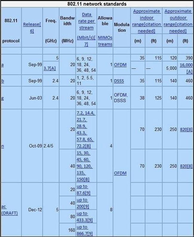 এটা রাউটার ভেদে আলাদা হয়। তবে সাধারণত বাসায় যেই রাউটার ব্যবহার করা হয় তা ২.৪ গিগাহার্জ এর হয়ে থাকে। এছাড়াও রাউটার যে সিগন্যাল পাঠায় তার মধ্যে প্রকারভেদ আছে। এগুলো হল 802.11a, 802.11b, 802.11g এবং 802.11n, এই প্রকারভেদ অনুযায়ী ওয়াইফাই রাউটার বিভিন্ন স্পিড এ ডাটা সেন্ড ও রিসিভ করে। নিচে এর একটি ছক দেয়া হল।