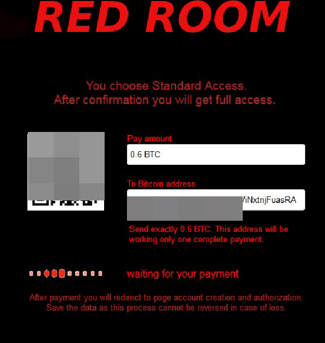 পেমেন্ট সম্পন্ন হওয়ার পর, আমরা রেড রুম ডীপ ওয়েবে অ্যাক্সেস পাব এবং সেখান থেকে এগিয়ে যেতে পারব। মূলত, প্রতিটি রেড রুম প্ল্যাটফর্মের নিজস্ব হোমপেজে তালিকাভুক্ত একটি বিটকয়েন ঠিকানা রয়েছে, এবং আপনাকে ঠিকানাটির জন্য অর্থ প্রদান করতে হবে এবং আরো নির্দেশাবলীর জন্য অপেক্ষা করতে হবে।