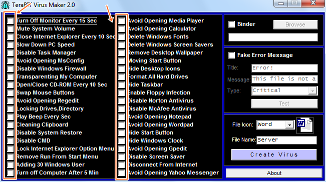 ভাইরাসের কাজ কী হবে অর্থাৎ তা কী কী ধরনের ক্ষতি করবে তা সিলেক্ট করে দিন আপনার ইচ্ছামত-