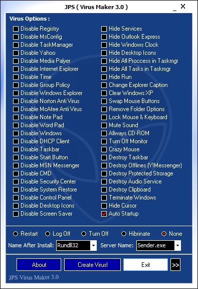 সর্বশেষ create virus-এ ক্লীক করুন। ব্যাস...ভাইরাস তৈরী শেষ। তবে শুধু এটা না, আমার কাছে আরও দুই-একটি এই রকম ভাইরাস মেকার আছে। স্ক্রীনশর্ট-