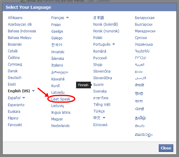 তবে leet জানার একটা চমৎকার পদ্ধতি ফেসবুক হতে পারে! কারন যত দেখবেন তত বেশি জানবেন। ফেসবুক আপনাকে এই দেখার সুবিধাটি দিবে। শুধু english ভাষার পরিবর্তে leet সিলেক্ট করে দিন। প্রথমে আপনার অ্যাকাউন্টে লগইন করুন। তারপর একেবারে নিচের দিকে যান। ভাষা যেখানে English সিলেক্ট করা আছে, সেখানে ক্লীক করুন-