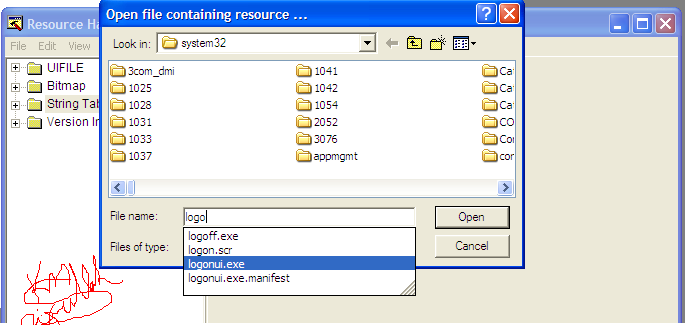 এবার ব্যাপারটা একটু সহজ করে দিই Windows Xp তে যে Welcome লেখা টা আসে তার উপর একটু কেরামতি করব তাই Resource hacker টা ওপেন করুন ও C:\windows\system32\logonui.exe এই স্হান থাকা ফাইলটি কে খুলুন।