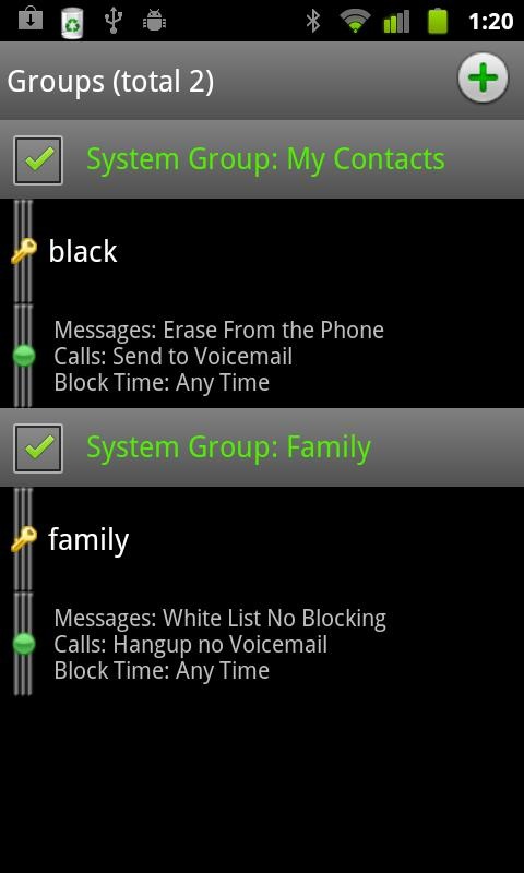* Black list: Add individual numbers to be blocked, each number can be blocked in different ways, support timers to block based on day, hour and minute. Also block UNKNOWN, PRIVATE or other restricted numbers, and option to block all numbers not in contact book. Use wildcard match to block an area code. Option to send auto text message reply to blocked calls and messages.
