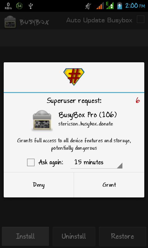 # এরপর উপরের দেয়া BusyBox Pro ইন্সটল সিন আপনার মোবাইল এ ! ইন্সটল হলে ওপেন করুন...ওপেন করলে SuperSu Box আসবে...সেখান থেকে Grant এ ক্লিক করবেন !