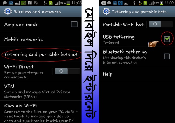 এবার Settings>Wireless & Networks>Tethering & portable hotspot গিয়ে USB tethering টিক চিহ্ন দিয়ে দিন উপরের মত করে।