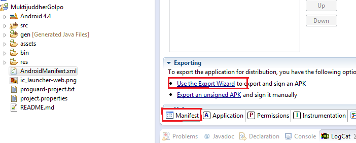 গুগল প্লেতে আপনারা কিভাবে এপস পাবলিশ করবে তা নিয়ে বলব। প্রথমে Eclips গিয়ে আপনার প্রজেক্টের androidMainifest.xml ফাইলে ক্লিক করুন। Exporting অংশে use the export wizard এ ক্লিক করুন।