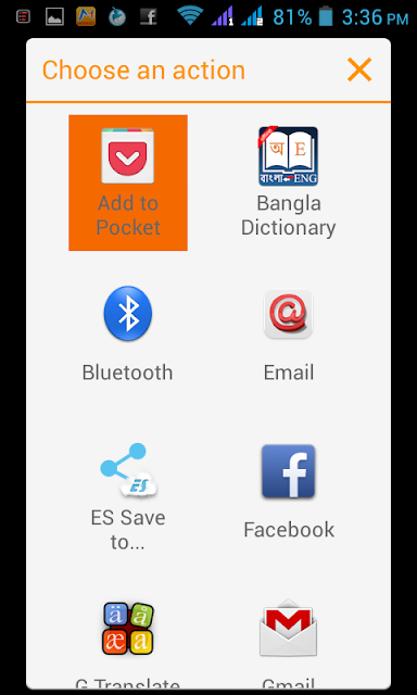 অথবা আপনি যদি চান শুধুমাত্র আপনার স্মার্টফোন থেকেই সম্পূর্ণ কাজটি করতে তাহলে ফোন এর ব্রাউজারের শেয়ার অপশন থেকে “Add to Pocket” অপশনটি সিলেক্ট করে দিন। তারপর পকেট অ্যাপটি ওপেন করলে দেখতে পারবেন অ্যাপটি স্বয়ংক্রিয়ভাবে আপনার সংরক্ষিত পেজগুলো সিঙ্ক করে নিচ্ছে তাদের ওয়েব সার্ভার থেকে কোন ঝক্কি ঝামেলা ছাড়াই।
