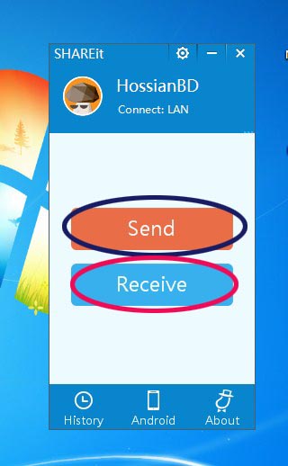 আপনি যদি আপনার মোবাইলে কিছু পাঠাতে চান তাহলে Send এ ক্লিক করুন আর যদি মোবাইল থেকে কিছু নিতে চান তাহলে Receive বাটনে ক্লিক করুন।