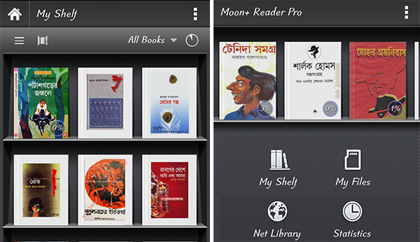 আপনার জন্য রয়েছে সুদৃশ্য বুক শেলফ। Moon+Reader Pro আপনার ফোনে ইনস্টল দেওয়ার পর আপনার স্টোরেজে Books নামে একটি ফোল্ডার তৈরী হবে। তার মাঝে Moon Reader নামে আরো একটি ফোলডার পাবেন। সেখানে আপনার বই গুলো রাখলে রিডারে সুদৃশ্য বুকশেলফ দেখতে পাবেন। যেখানে আপনার প্রত্যেকটি বই সাজানো থাকবে। তাছাড়া আপনার সম্প্রতি পড়া বই সমূহ কতটুকু শেষ করেছেন তার পারসেন্টেজ দেখতে পাবেন অ্যাপসটি চালু করলেই।