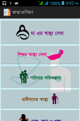 (১) মায়ের স্বাস্থ্যসেবা (২) শিশুর স্বাস্থ্যসেবা (৩) প্রবীণদের স্বাস্থ্য (৪) পরিবার পরিকল্পনা (৫) নাক, কান ও গলা (৬) চোখ (৭) ফুসফুস ও শ্বাসনালী (৮) হৃদপিন্ড ও রক্তনালী (৯) স্বাস্থ্য বিষয়ক সচেতনা (১০) মোবাইলে স্বাস্থ্যসেবা মেনুর অধীনে শারিরীক সমস্যা সমাধানের জন্য টিপস।