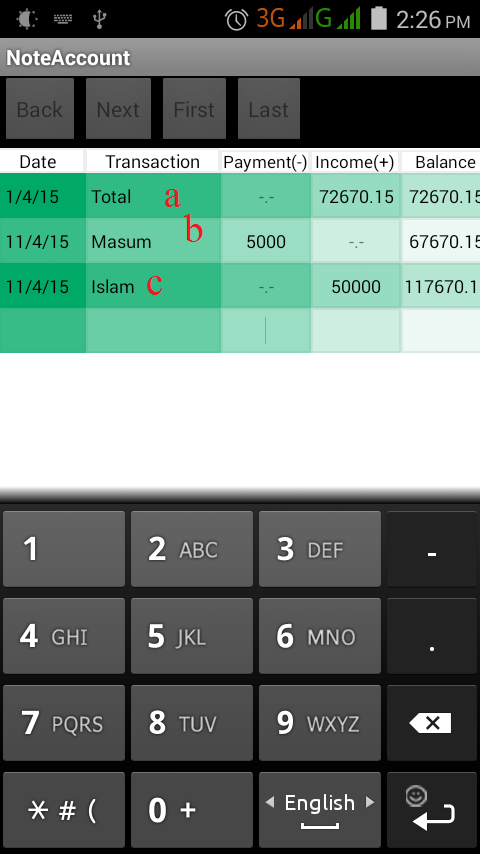 a) দেখেন আমি এইখানে Transaction এর ঘরে Total লিখেছি, তার পাশে Income+ এ ৭২৬৭০.১৫ টাকা লিখেছি। এই টা হচ্ছে আমার এই মাষের মোট ইনকাম।