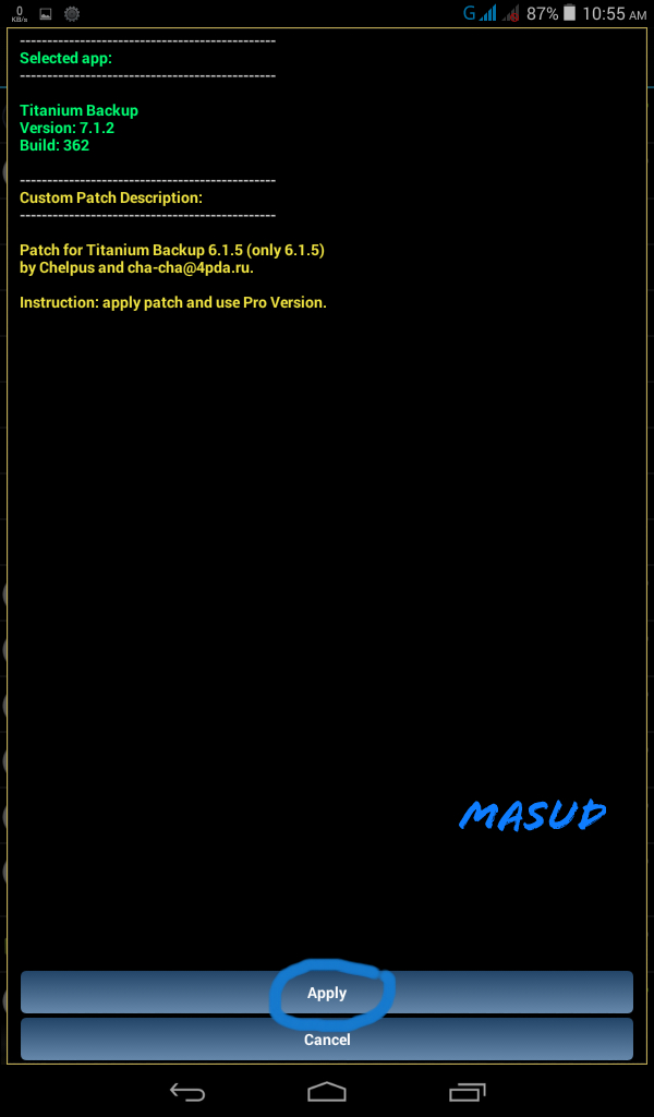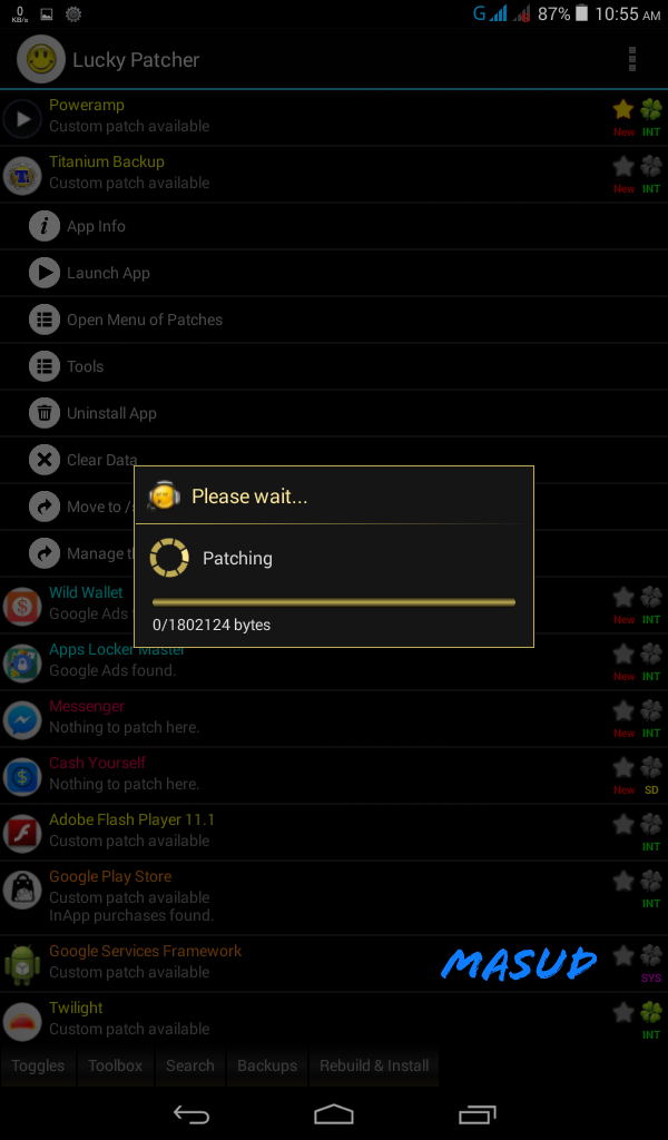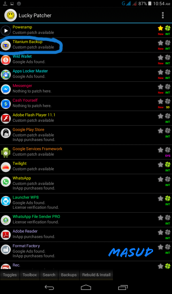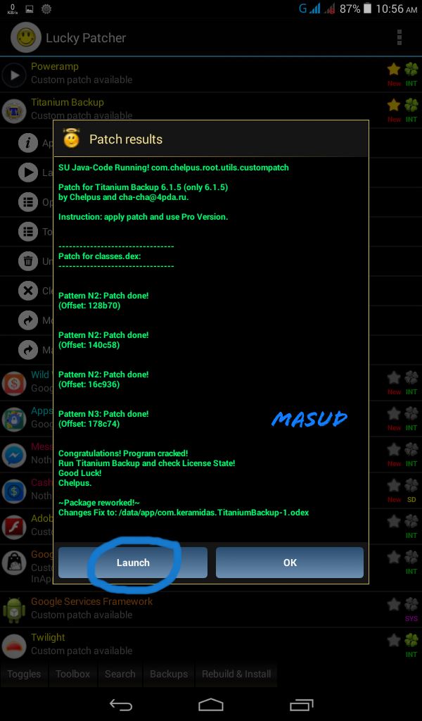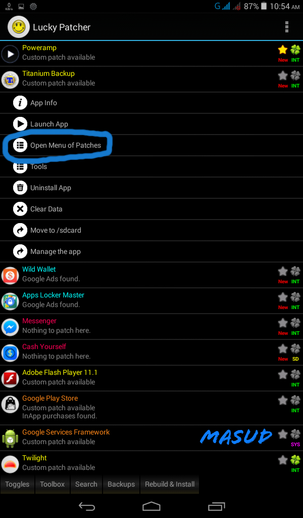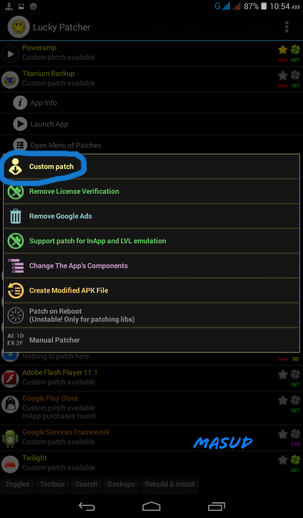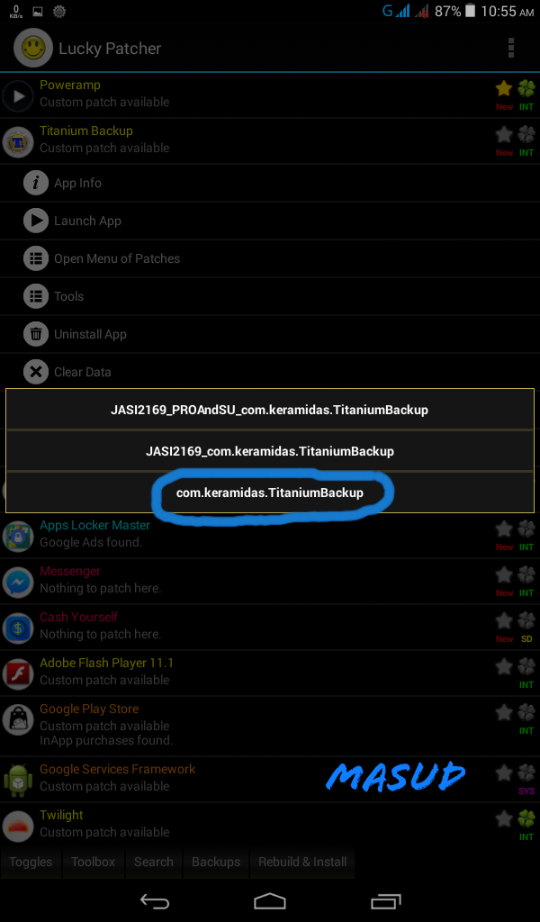 lucky patcher অপেন করুন। একদম উপরেই TITANIAM BACKUP এপসটি দেখতে পাবেন। এরপর নিচের screenshot অনুযায়ী কাজ করেন।