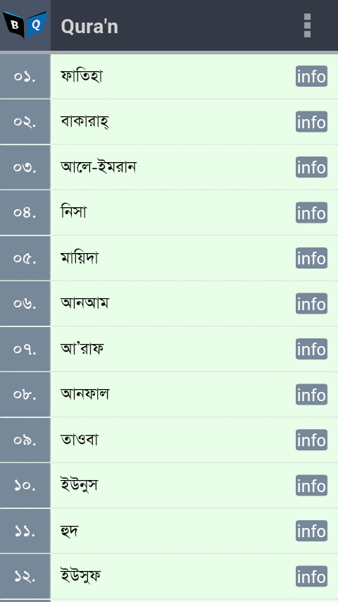 ৪. প্রতিটি সূরা সকল তথ্য (আয়াত,শুরু,শেষ,রুকু,ধরণ ইত্যাদি।)
