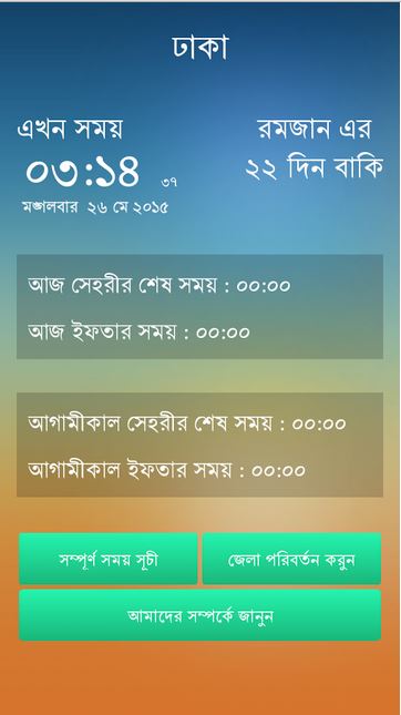 রমজান মাসে আমাদের যে বিষয় নিয়ে সবচেয়ে বেশি মাথা ব্যাথা সেটা হল সেহেরী আর ইফতারির সময়সূচী। অনেকেই টিভি খুলে বসে থাকেন আবার অনেকেই ক্যালেন্ডার বা অন্য কোন কাগজ খোঁজ করেন সময় দেখার জন্য। এই অ্যাপের মাধ্যমে আপনি খুব সহজেই যে কোন সময় আপনার মোবাইল থেকেই সময়সূচী দেখে নিতে পারবেন। নিচে এই অ্যাপটির একটি স্ক্রীনশট দেখে নিনঃ