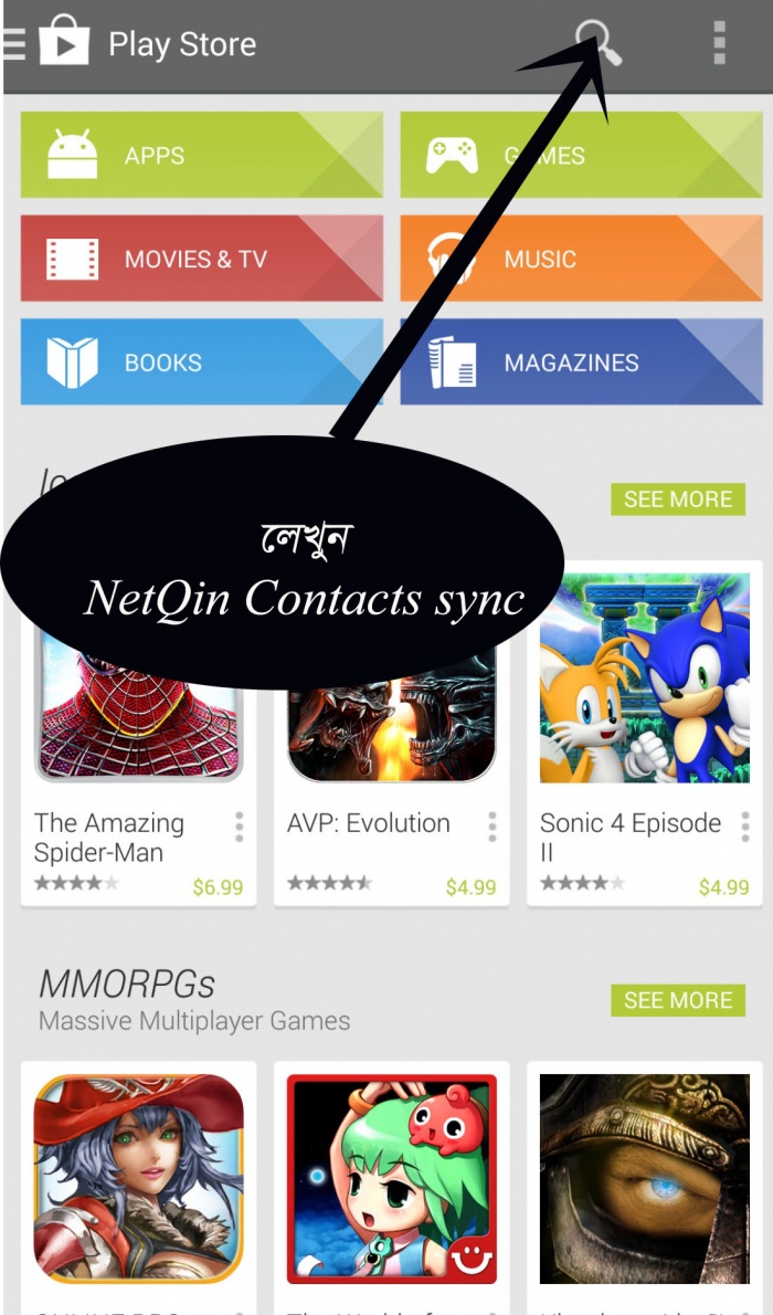 ১. প্রথমে আপনাকে আপনার মোবাইলে play store এ গিয়ে সাচ বাটনটিতে ক্লিক করে লেখতে হবে NetQin Contacts Sync যা নিচের চিত্রে দেওযা আছে-