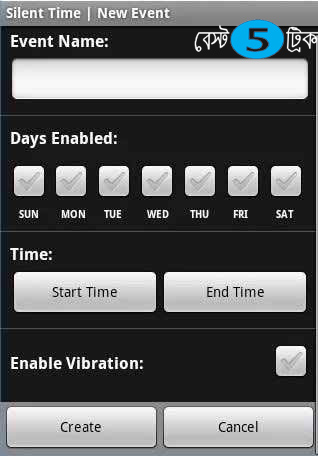 ৩) তারপর ইভেন্টের নাম এবং দিন নির্ধারণ করে অটোমেটিক আপনার মোবাইল সাইলেন্ট হওয়ার জন্য Start time -এ সাইলেন্ট হওয়ার সময় এবং End Time-এ জেনারেল (রিং) মোডে যাওয়ার সময় সেট করে দিন।