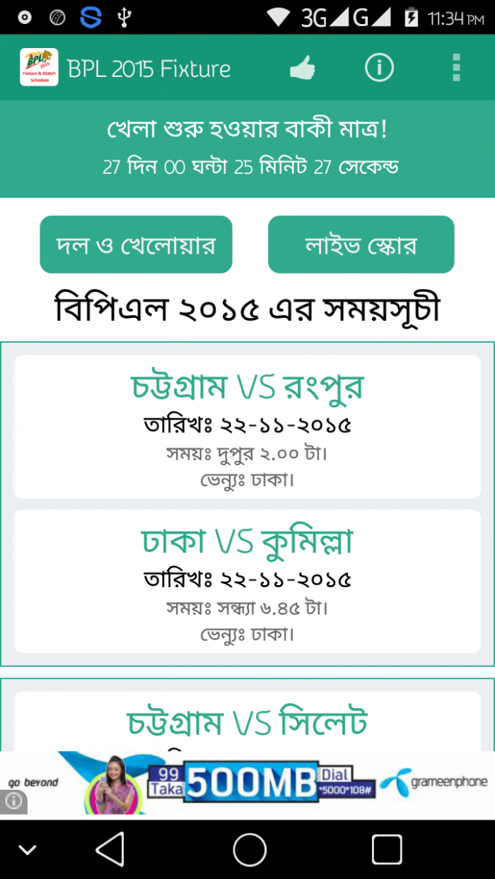 বি.পি.এল ২০১৫ খেলার সময়সূচী এবং লাইভ স্কোর দেখার জন্য এবার মোবাইল অ্যাপ নিয়ে আসলো মোবাইল অ্যাপ নির্মাতা কোম্পানী NR Soft BD। এপ্লিকেশনটির নাম বি.পি.এল ২০১৫ সময়সুচী।