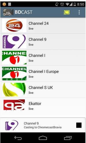 অনেকেই মেসেজে জানান যে কীভাবে টিভি দেখবো??তাদের জন্য আমার এই টিউন।অনেক খোজাখোজির পর একটি এপ পেলাম,যার মাধ্যমে আপনি এন্ড্রয়েডে এম্বির মাধ্যমেই টিভি দেখতে পারবেন/এপটির নাম হলোঃ BD Cast.এপটি অনেক ভালো,আপনি আরামে বসে কম এম্বি দিয়েই টিভি দেখতে পারবেন,রয়েছে অনেক চ্যানেল।
