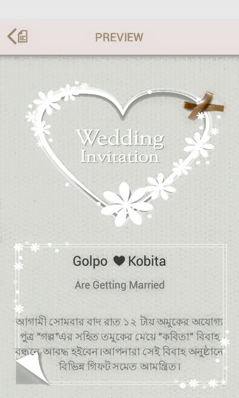 নিচের ডাউনলোড লিংক থেকে অ্যাপ টা ডাউনলোড করে অপেন করুন।তারপর যা কিছু ফর্মালিটিসস আছে সেগুলা লিখুন।আপনার আর (অন্যকারো) নাম লিখে নিচে লিখুন Are Getting Married!! তারপর নেক্সট এ ক্লিক করে সেভ করুন এন্ড পাঠিয়ে দিন (তাঁকে)! আর দেখুন আপনার হেতির Reaction!!আশা করি বুঝাতে পেরেছি 😀