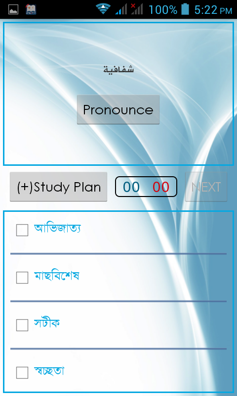 *MCQ আকারে পরীক্ষা দিতে পারবেন।একটি শব্দ দেয়া থাকবে যার চারটি অপশন থাকবে।এর মাঝে কোনটা সঠিক সেটায় ক্লিক করতে হবে।ভুল হলে কোনটা সঠিক সেটা জানিয়ে দিবে।এছাড়া পরীক্ষা শেষে আপনি কত নম্বর পেলেন সেটাও দেখিয়ে দেবে।