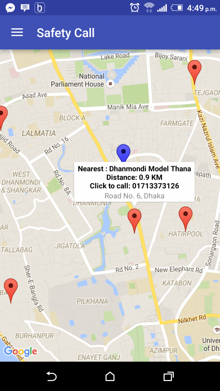 এখানে নীল রঙের মার্কারটা হচ্ছে ব্যবহারকারীর অবস্থান আর লাল মার্কারগুলো হচ্ছে নিকস্থ থানা ও র্যাব অফিসগুলোর অবস্থান। প্রত্যেকটি সাদা মার্কার window তে থানার নাম, আপনার অবস্থান থেকে থানার দূরত্ব, থানার ওসির ফোন নাম্বার, এবং থানার ঠিকানা দেখাবে। এখন কেবল Click to call লেখা সাদা window টার উপর ক্লিক করলেই কল চলে যাবে ওই থানার ওসির কাছে। অ্যাপটিতে দেয়া প্রত্যেকটি ফোন নাম্বারই ভেরিফাই করা পুলিশ ও র্যাবের নিজস্ব ওয়েব সাইট থেকে নেয়া।