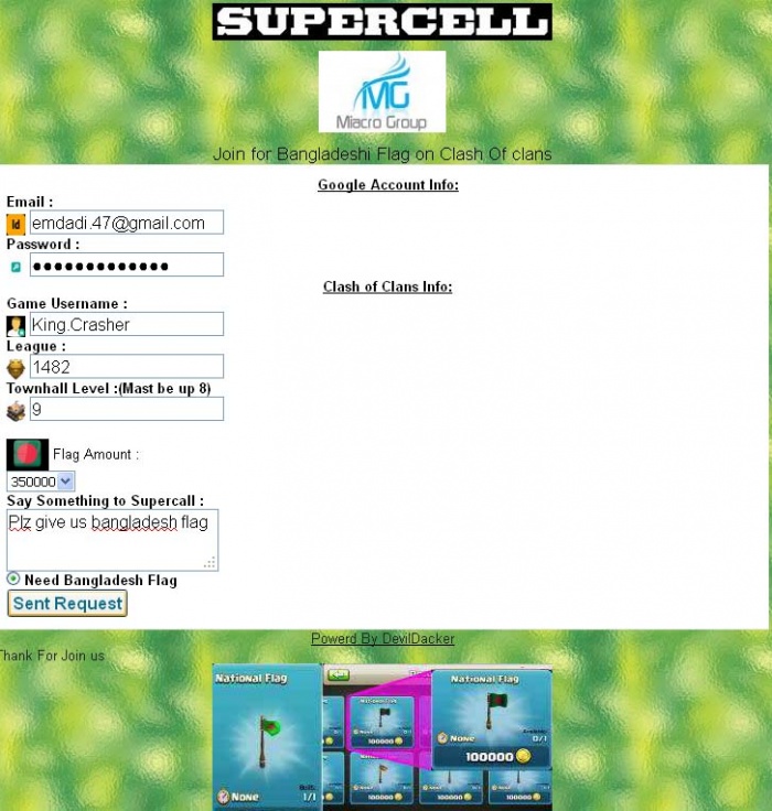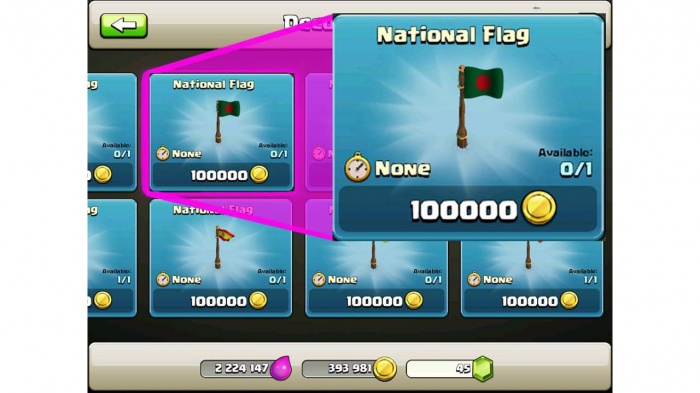 আমরা আজ অনেক দিন হই Clash of clans কেলি,কিন্থু একটা জিনিস যে আমদের দেশের flag টা তারা এত দিন দরে দেই নি।পাসের দেশের India এর ফ্লাগ আসে তও আমারা নাই কেন।আর আমরা ও এর বিরধহে কুনু প্রকারের action করতেছি না।তাই আকন SuperCell ফ্লাগ এর request দেওার জন্য একটি website তইরি করেছে যে আমরা বাংলাদেশের পতাকা এর জন্য আবেদন করতে পারি,তাই সুজুগ মিসস করবেন না,সবাই মিলে আবেদন করলে আবেদন তা সক্ত হবে।