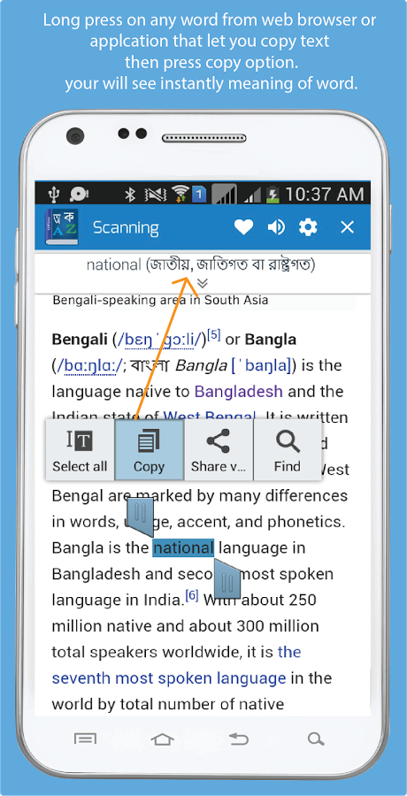 ওয়েব সাইট ব্রাউস করতে গেয়া অর্থ বুঝতে পারছেন না,কোন সমস্যা নাই, শুধু লং প্রেস করে কপি অপশন এ ক্লিক করুন সাথে সাথে অর্থ দেখবেন,