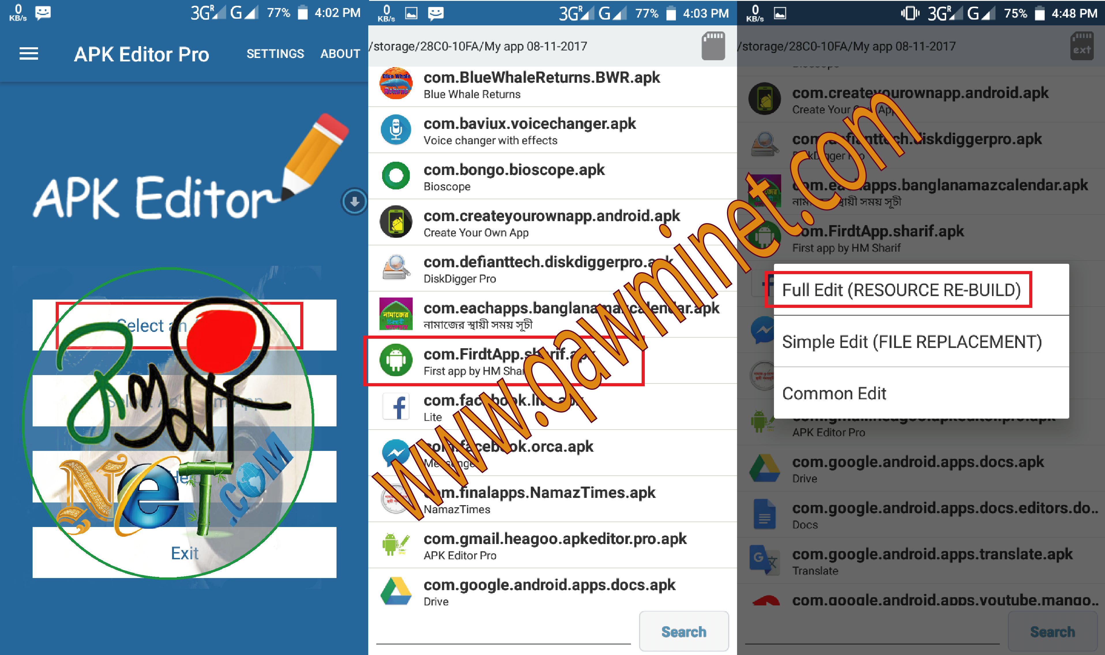 Apk Editor pro ওপেন করুন। এখন select apk from app এ ক্লিক করে first app by HM Sharif এ ক্লিক করুন। তারপর common Edit এ ক্লিক করুন।